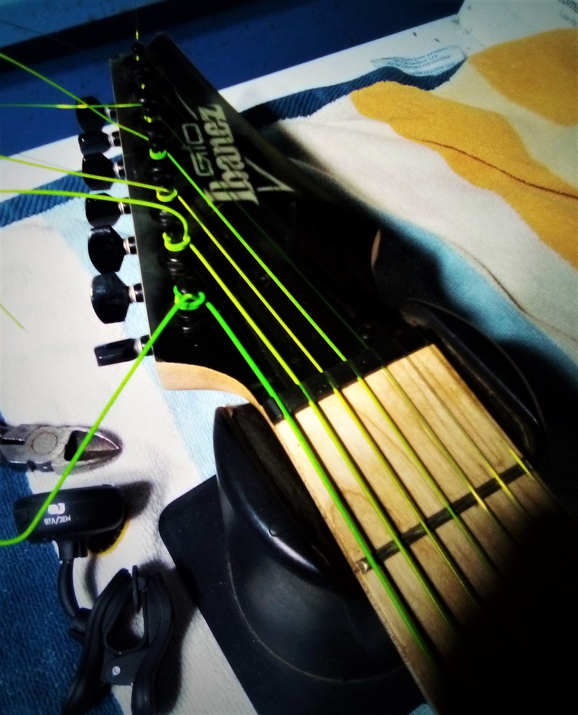 And as some of you also know, I am a blunt/direct person. I left GHS Strings after six years as an artist endorser. I reached out Aurora Strings in Bridgeport, CT last weekend and talked with the rep Jake. He was very happy to have me on board, very accommodating. He gave me the terms of my endorsement and that was it. I have one set of bright green strings (!!) on the blue Ibanez 7. The shop is closed for vacation but I will order more strings very soon. I am very excited and pleased to be part of the Aurora team, plus it’s nice to have colors back on my guitars after many years.